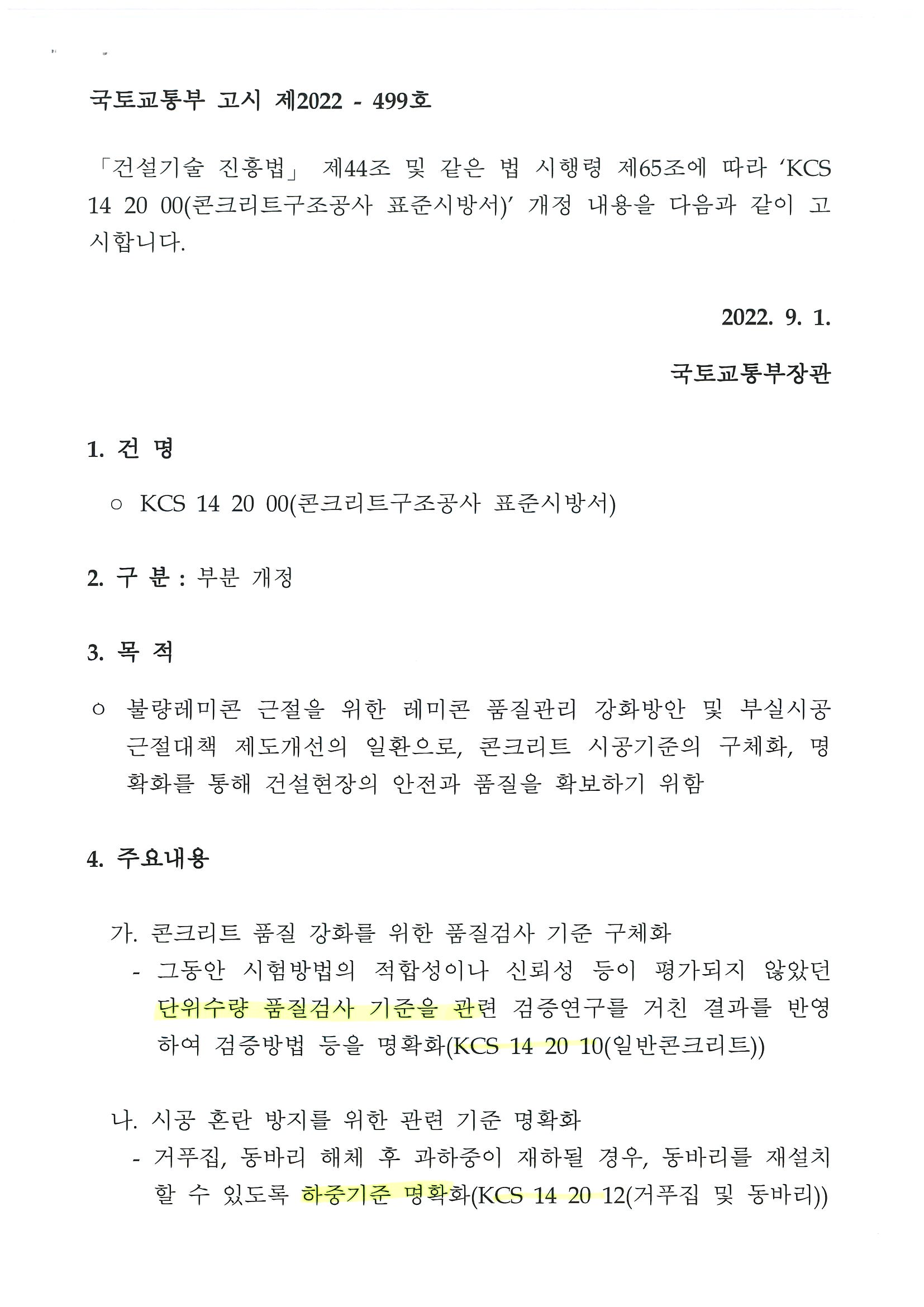 KCS 14 2010 일반콘크리트 (2022년 9월 1일 개정) 표 3.5-2 콘크리트의 받아들이기 품질 검사 항목 시험⋅검사 방법 시기 및 횟수 판정기준 굳지 않은 콘크리트의 상태 외관 관찰 콘크리트 타설 개시 및 타설 중 수시로 함 워커빌리티가 좋고, 품질이 균질하며 안정할 것 슬럼프 KS F 2402의 방법 최초 1회 시험을 실시하고, 이후 압축강도 시험용 공시체 채취 시 및 타설 중에 품질변화가 인정될 때 실시 KS F 4009의 슬럼프 허용오차 이내 슬럼프 플로 KS F 2594의 방법 KS F 4009의 슬럼프 플로 허용오차 이내 공기량 KS F 2409의 방법 KS F 2421의 방법 KS F 2449의 방법 허용오차 : ±1.5% 온도 온도측정 정해진 조건에 적합할 것 단위용적질량 KS F..